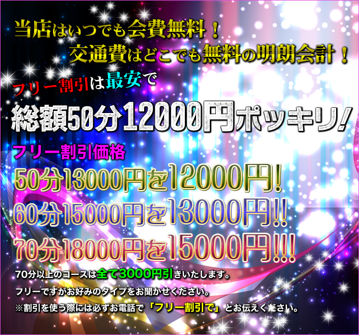 "☆全域交通費無料・入会金無料の明朗会計デリヘル☆ フリー割引(おまかせ割引)最安50分12000円実施中。"